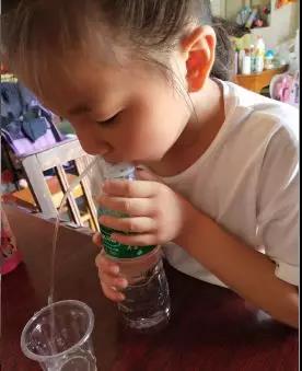 一(5)班的朱佳滢同学发现对着瓶口吹气,水竟然能从吸管中流出来。 于是,在家长的指导下,朱佳滢同学进 行了小实验的探究与验证。首先,她将纸团塞在瓶口,用吸管向瓶口吹气,发现纸团轻松的就被吹了出来。这一现象的产生巧妙地解释了气压的存在——瓶子内部充满了空气,这时候对着瓶内纸团吹气,气通过纸缝进入瓶内,等于变相的让瓶内的气体增多,压强变大,瓶口的压强比瓶子内部要小,所以纸团就被轻松地“推”了出来。这样一来,朱佳滢同学之前看到的“对着瓶口吹气,水能从吸管中流出来”这一现象就很容易被理解了——因为瓶内的气压大于外界的气。
