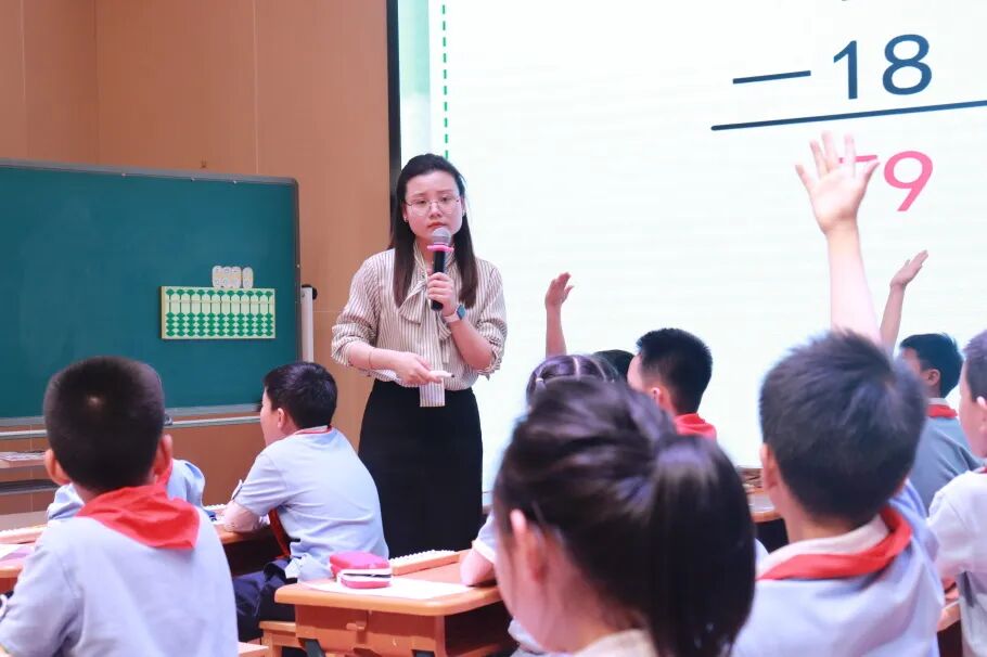 倪海琴老师执教的是《万以内的退位减(1)》。倪老师以孩子们喜闻乐见的“熊大、熊二走进数字王国”情境贯穿始终。课堂伊始,“看珠说数”游戏瞬间点燃了学生的热情,孩子们手持算盘,以清亮童声报出动态数字,洪亮的应答声在教室回荡。当教学进入“退位减奥秘”探究环节,倪老师创设了“小老师开讲啦”平台,孩子们争相走上讲台,边演示算盘退位操作边讲解“个位不够减,从十位退一当十”的算理,稚嫩却坚定的声音充满自信。在“我是算式创编家”环节,学生们自主设计的退位减法题通过“接龙”形式展示,此起彼伏的童声应答与算珠清响交织,展现出月华学子敢表达、善表达的风采。