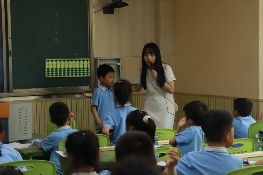 杨心玥老师执教的是《100以内的进位加(2)》一课,她以“超市小管家”生活情境引入这节课的教学,将数学思维训练融入角色扮演。她创设“兔子一家采购日”情境,让学生化身收银员计算胡萝卜面包价格。课堂中,学生通过“看珠说数”基本功唤醒已有认知,在“盲盒大抽取”游戏中自主探索进位规律。杨老师独具匠心地设计“珠算小诊所”环节,学生两两一组互相检验拨珠过程,在纠错中深化对“满十进一”的理解。当学生探究到29+25与25+29这两道算式时,杨老师引导学生比较这两个算式的结果和拨珠过程,将学生思维引向纵深。这堂课让学生在生活场景中培育了数学智慧,在互动纠错中提升了计算能力。
